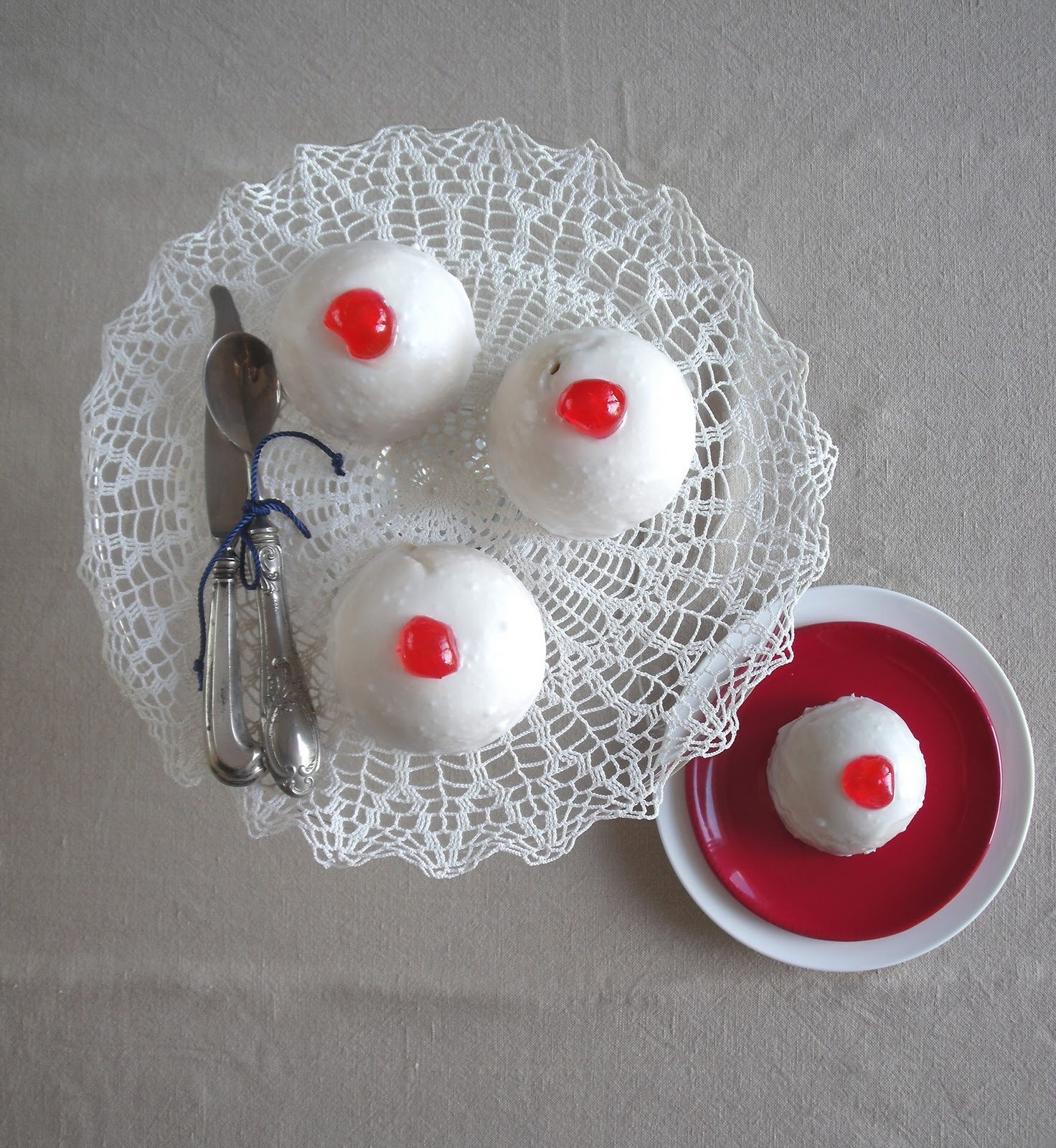 A questo punto preparate la glassa montando parzialmente gli albumi con un pizzico di sale. Aggiungere lo zucchero, il succo di limone e continuare a mescolare fino a ottenere una crema bianca, lucida e spumosa. Una volta estratte le cassatine dagli stampi colarvi sopra la glassa in modo uniforme, tenderà a solidificare velocemente.
