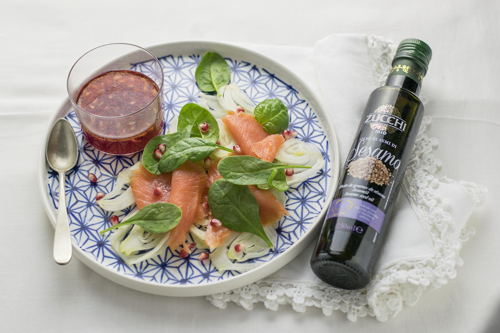 Insalata di finocchi, salmone con vinaigrette di melograno e olio di semi di sesamo Zucchi